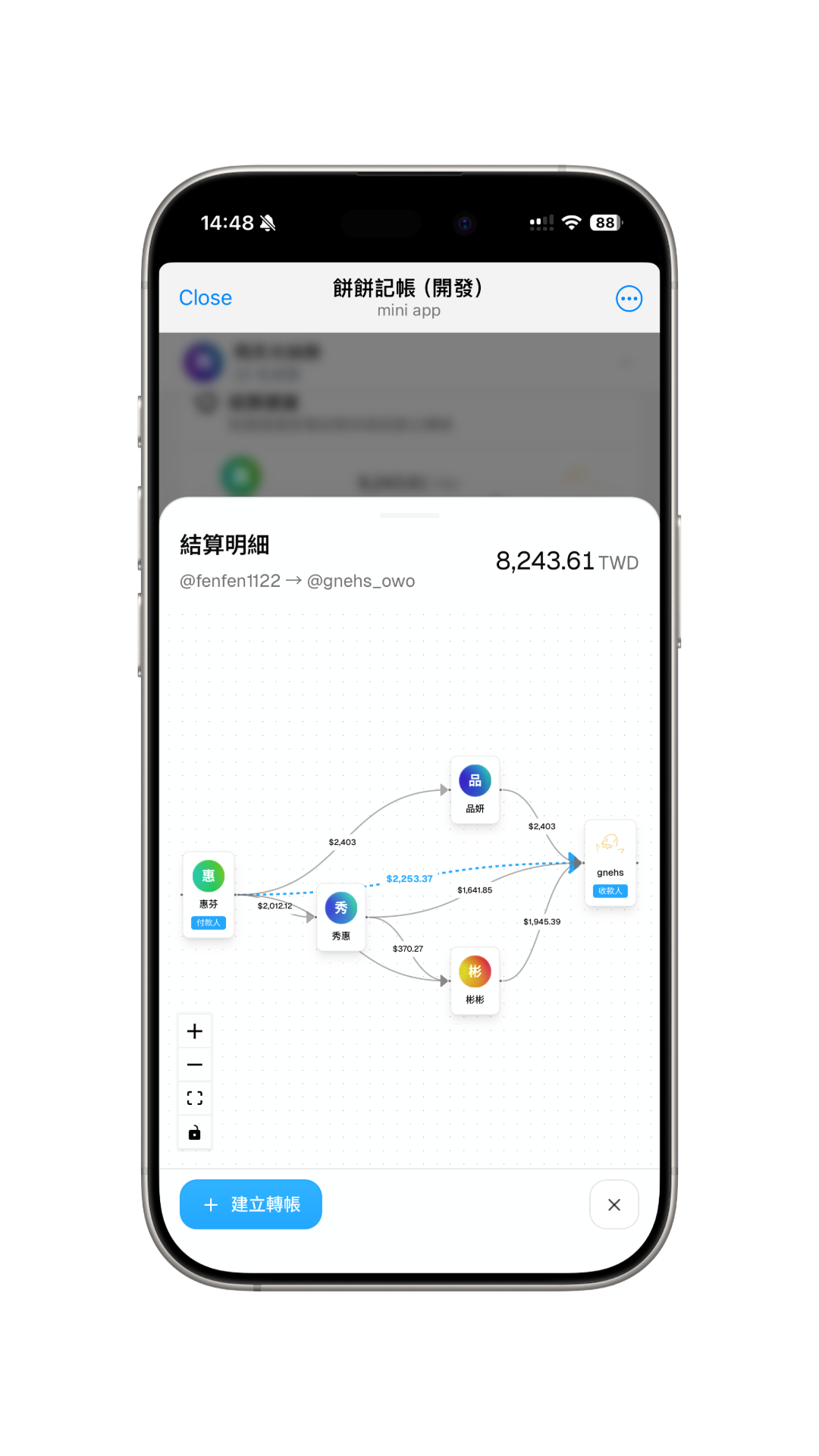 點選任一筆結算建議路徑,便會顯示債務流向圖,方便了解整體的結算情況,透過左下「建立轉帳」按鈕,可以快速建立轉帳交易。