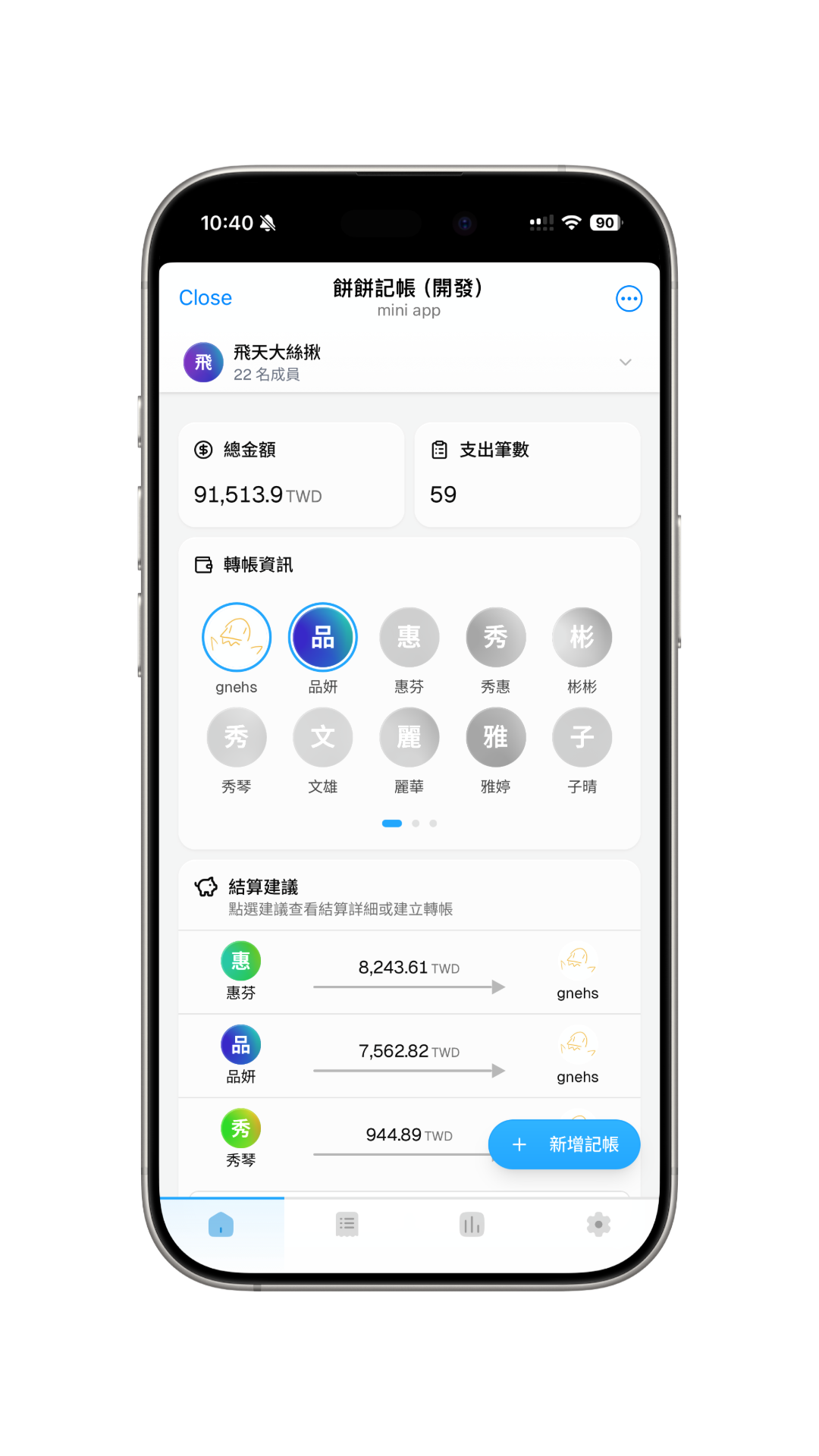 你可以在首頁看到群組的整體資訊,包括統計卡片、轉帳資訊和結算建議等功能。